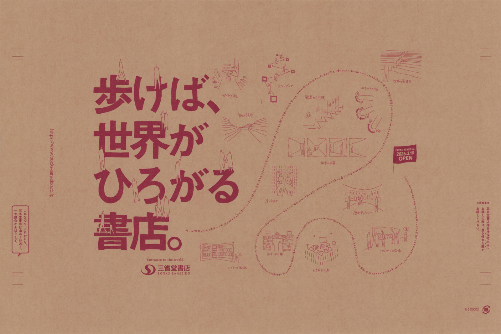 「歩けば、世界がひろがる書店。」は、新店舗のコンセプト。カバー袖には、「これまでも、これからも、三省堂書店は山あり谷あり。一生懸命がんばります。」の吹き出しと、「三省堂書店神田神保町本店へお越しの際は、履きなれた靴でお越しください。」との注意事項が記載されている。